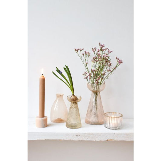 Glazen theelichthouder met goudkleurige rand.