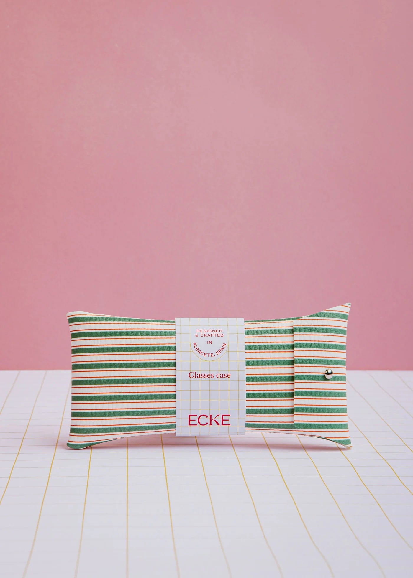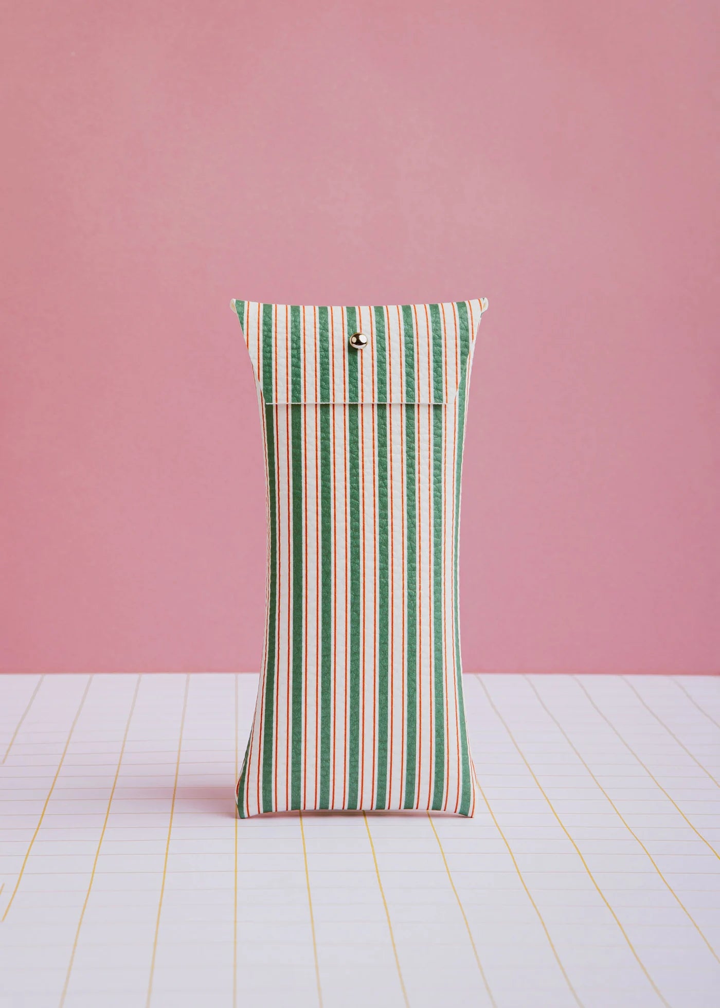 Jouw brillen verdienen een stijlvol etui! Dit handgemaakte etui in groene strepen beschermt je favoriete bril met flair. Gemaakt van duurzaam kunstleer en bedrukt met eco-vriendelijke inkt, combineert het functie met karakter.