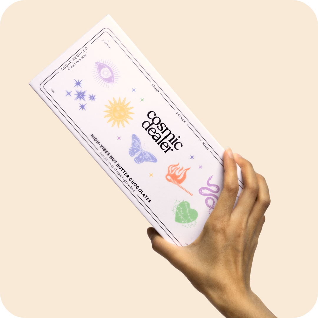 🍩 Kaneelbroodje: BuddyBuddy Cinnamon Roll notenboter (45%),* geroosterde amandelen ,* ahornsiroop,* kruidenmengsel - Ceylonkaneel,* Himalayazout, vanilleboon*), Cosmic Dealer pure chocolade (cacaobestanddelen: 75%)* (cacaomassa,* dadelpoeder*), cacaoboter*, dadels*