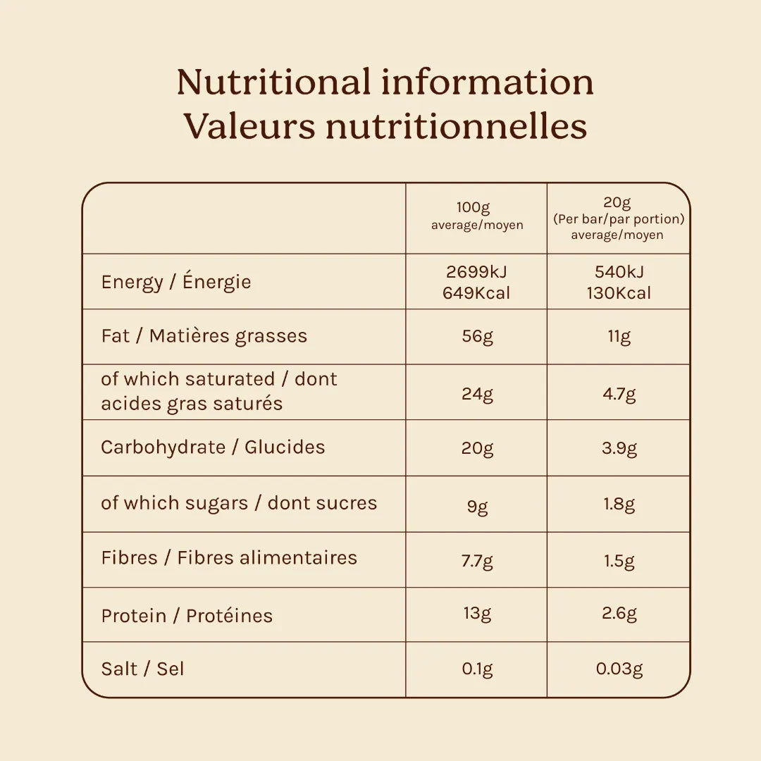 🥜 Pindakaas & gerookt zout: Pindapuree ,* 75% pure chocolade (cacaobonen, dadels),* gerookt zout*