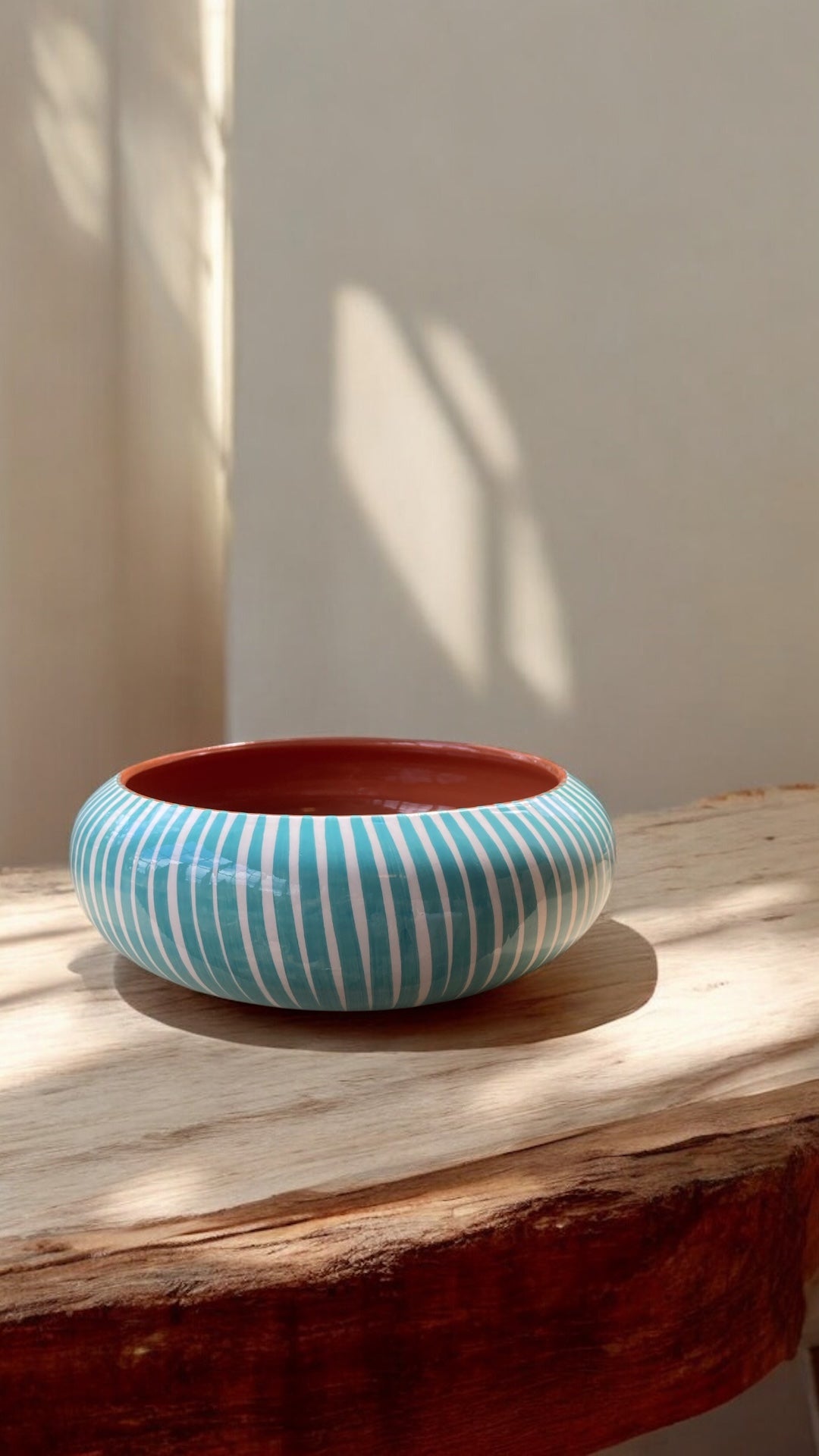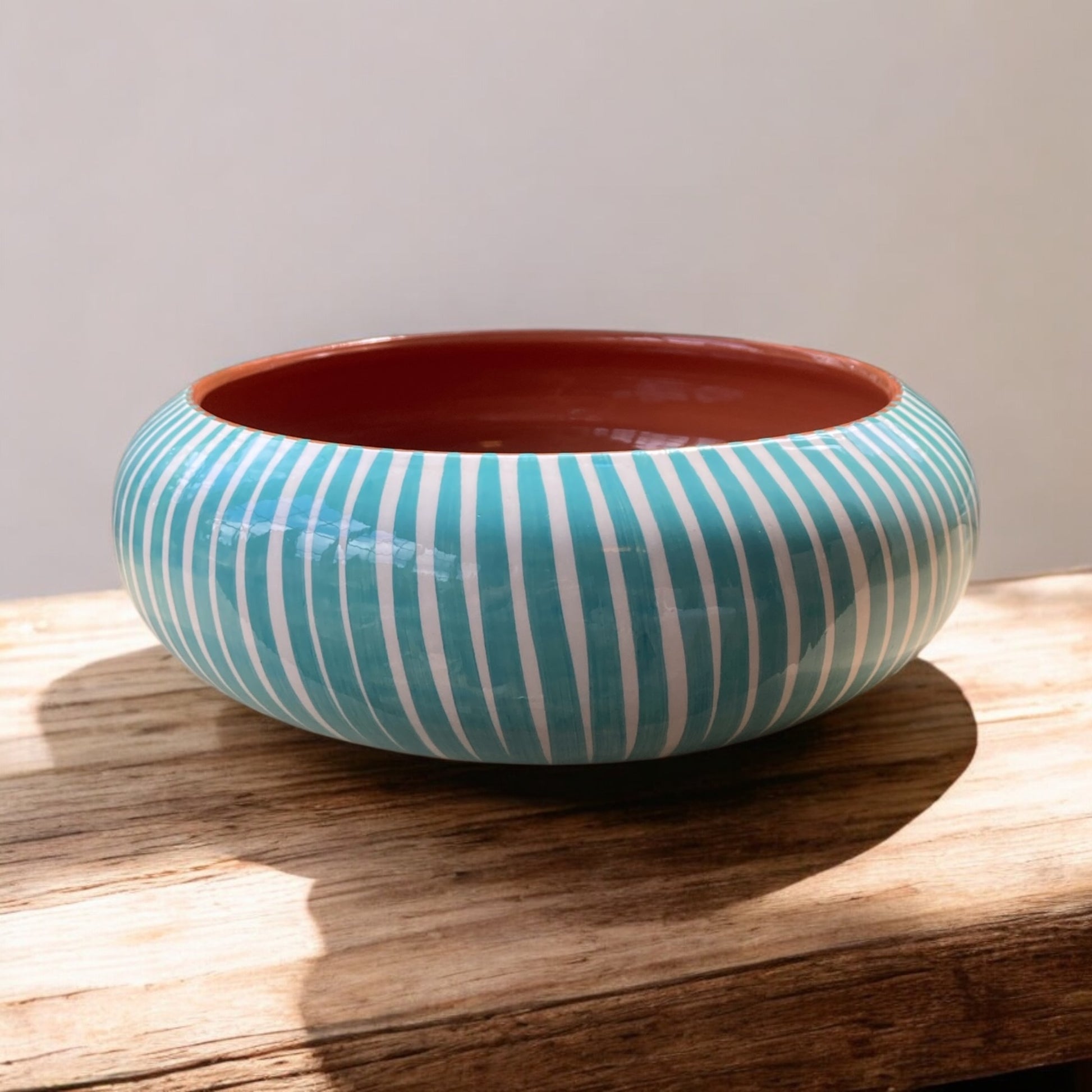 Elk stuk wordt gemaakt met behulp van een draaischijf – geen mallen hier! – en vervolgens met de hand beschilderd en geglazuurd. Hierdoor kunnen er kleine millimeterverschillen optreden tussen stukken van hetzelfde model. Maar deze verschillen maken deel uit van de unieke schoonheid en authenticiteit van dit product.